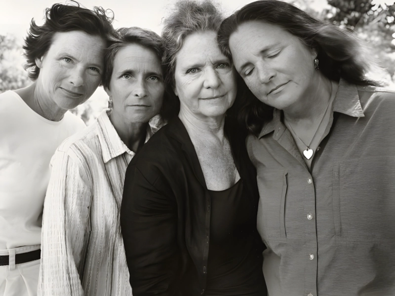 This radiant photograph is one of the most harmonious in the series, with all four sisters appearing content and at ease. Their expressions reflect a sense of peace and mutual understanding, as if they have reached a place of balance in their lives and relationships. The photograph beautifully illustrates their equal participation in this tradition, a testament to the harmony they have cultivated over the years.